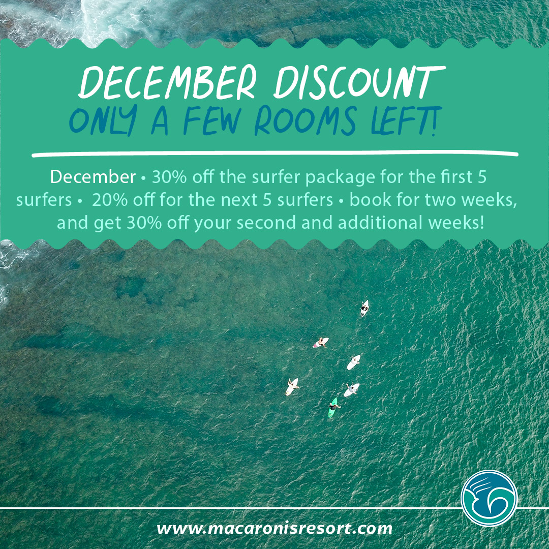 December, which is usually our secret time, is traditionally when we do our annual maintenance. This year, however, we have decided to open up for our customers to enjoy the uncrowded sessions. The first 5 surfers to book in the first 3 weeks of December get 30% off and the next 5 get 20% off. We still have a few rooms available for Christmas and New Year if anybody is interested in joining us.