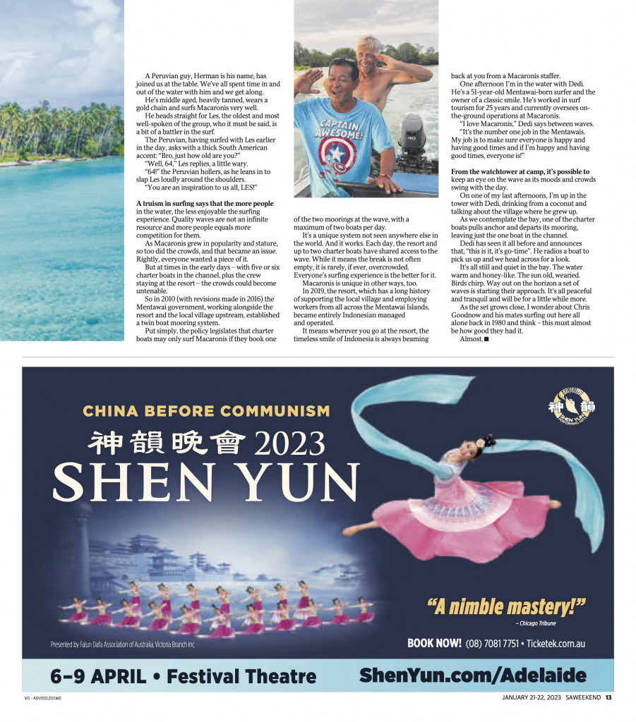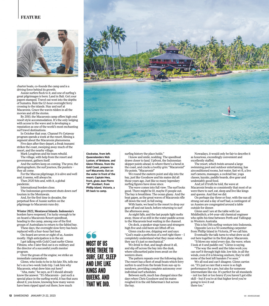 The Perfect Wave ~ An article by travel writer James Jacobi covering a short history of Macaronis and how it is now after the Covid restrictions are gone, surfing and staying at Macaronis Resort.